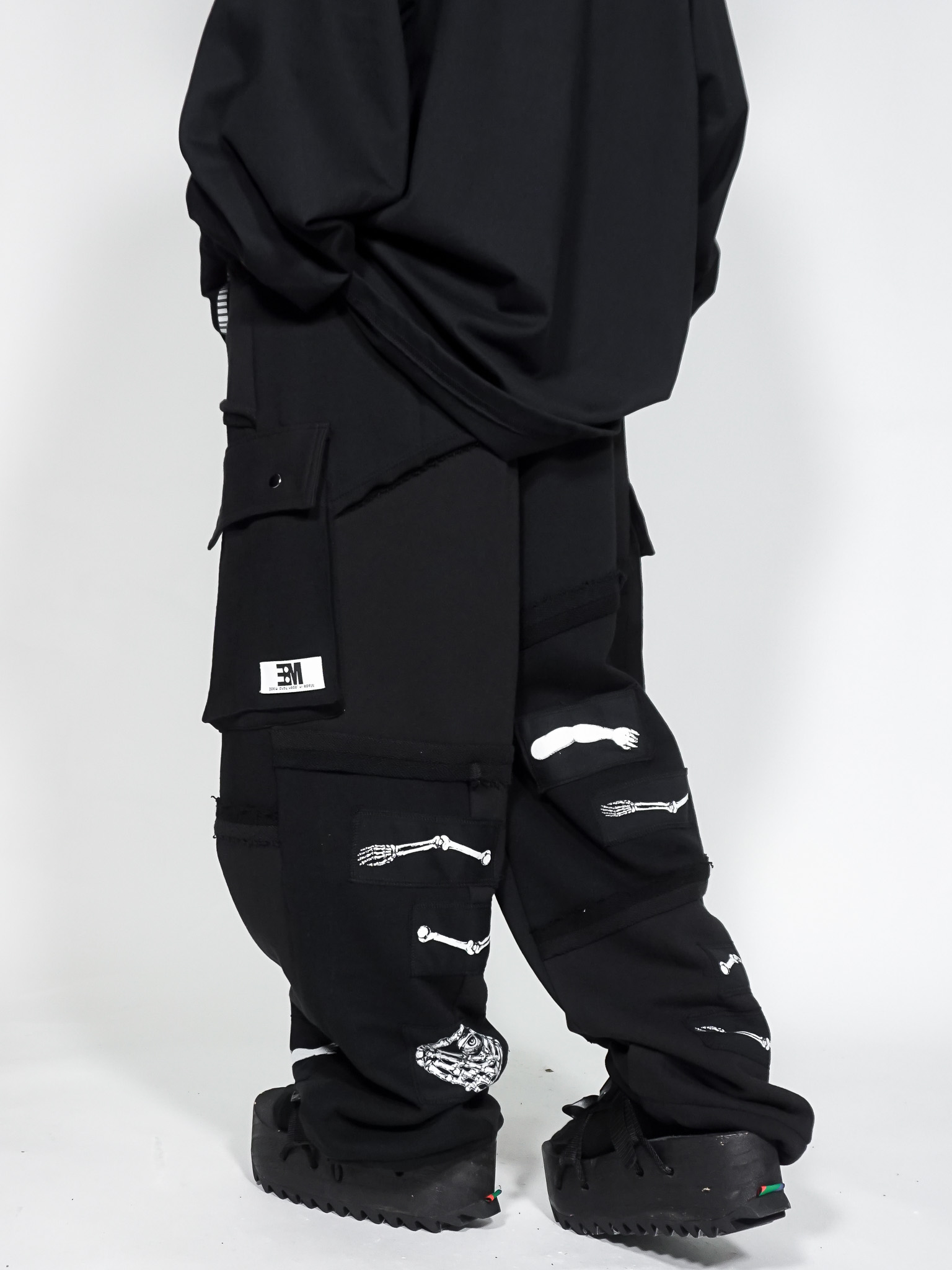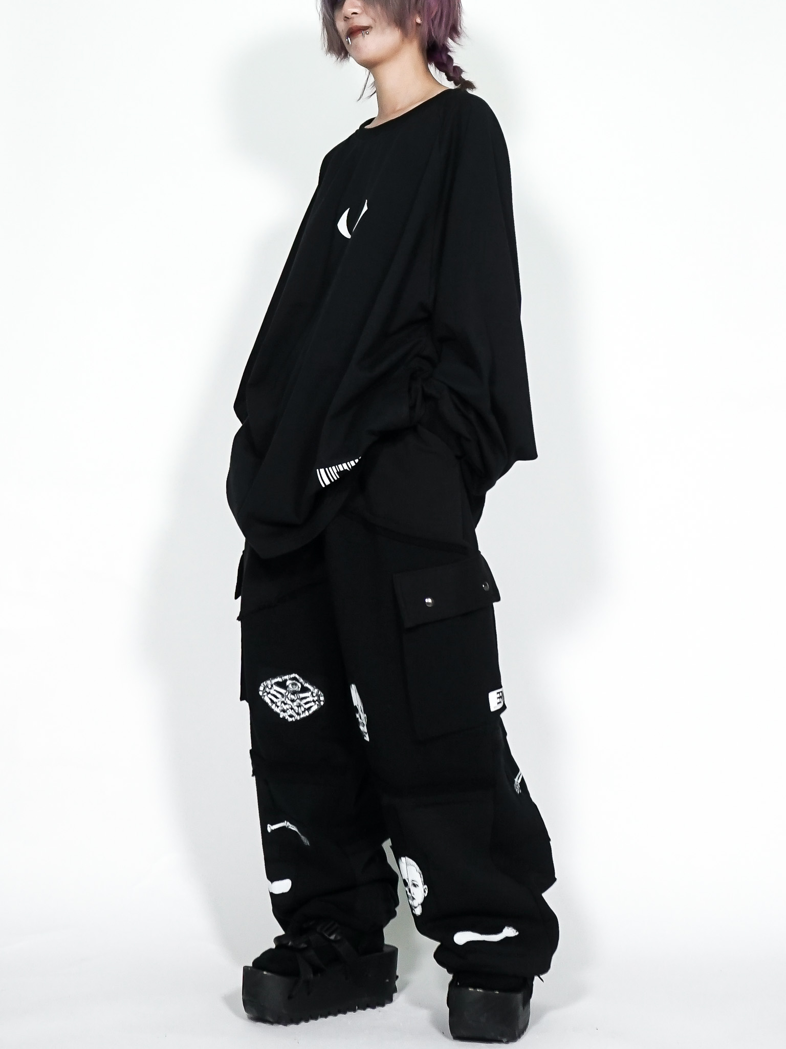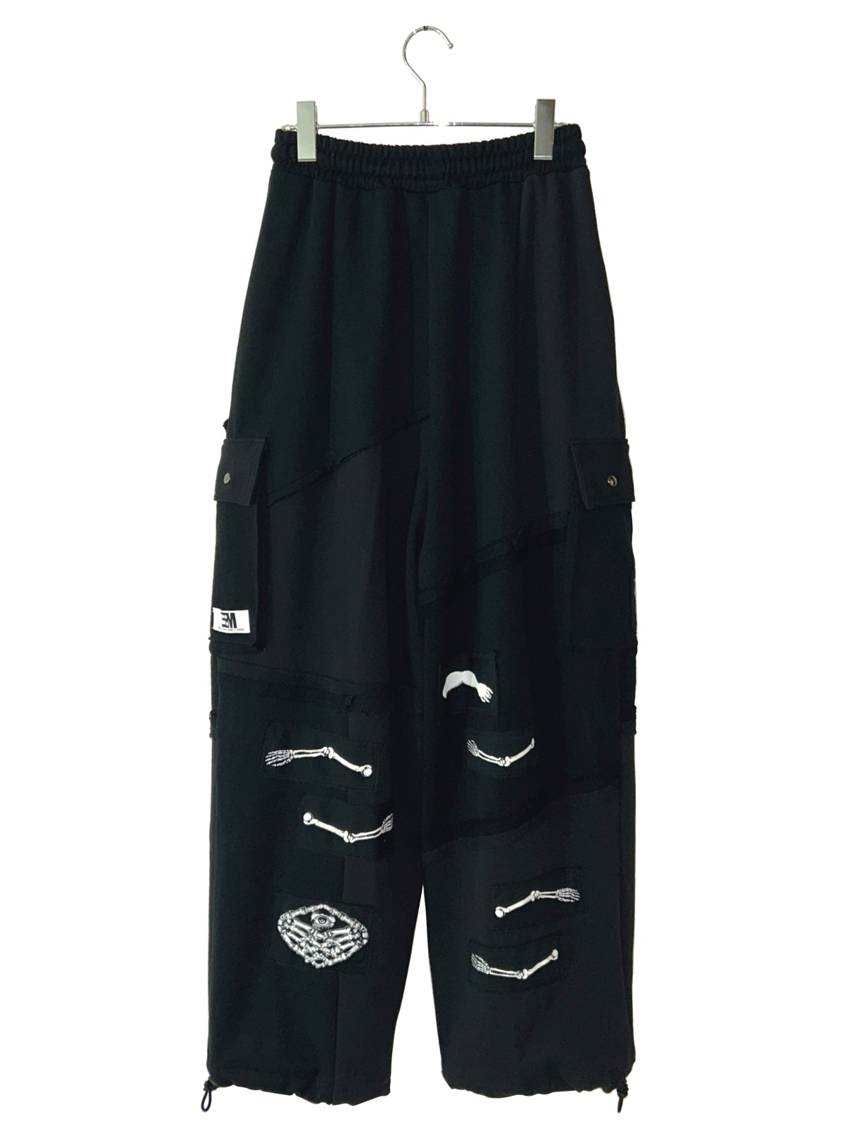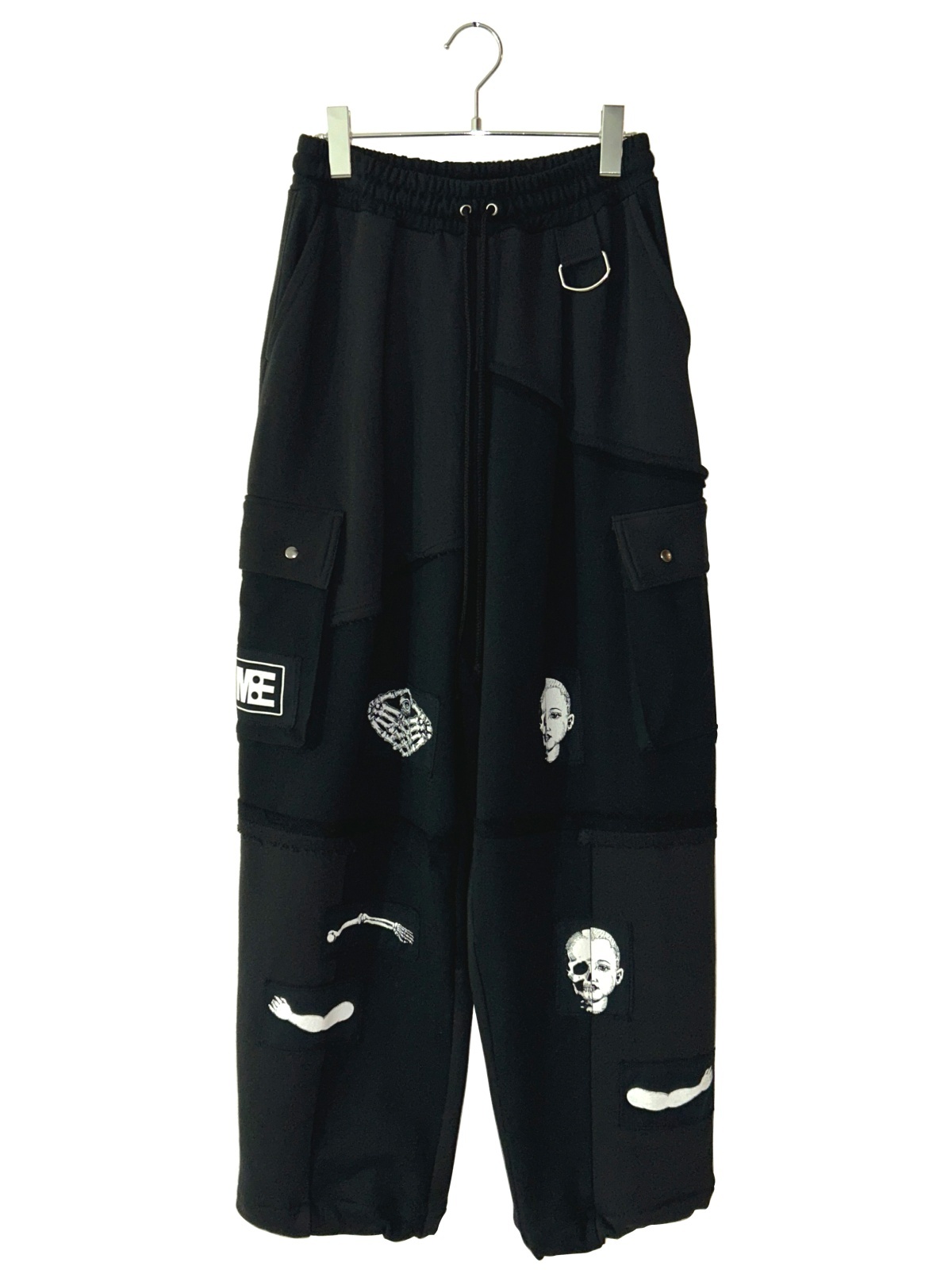 ※2種類の黒スウェット生地を使用したパッチワーク仕様のワイドカーゴパンツ、