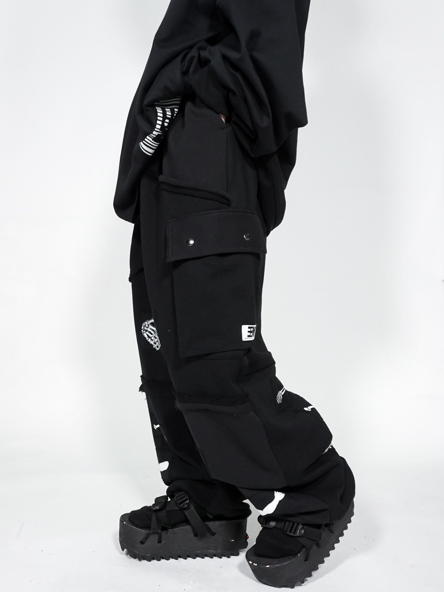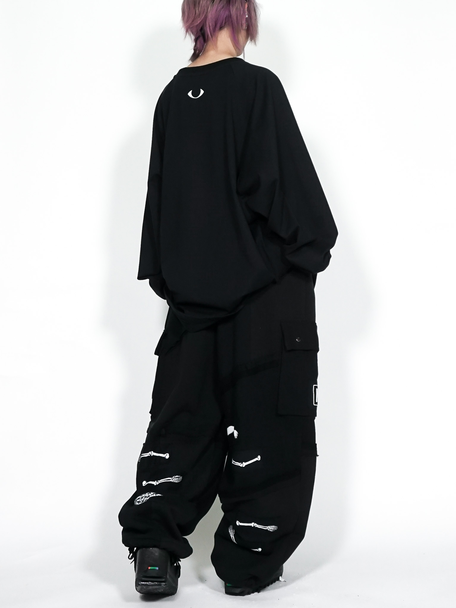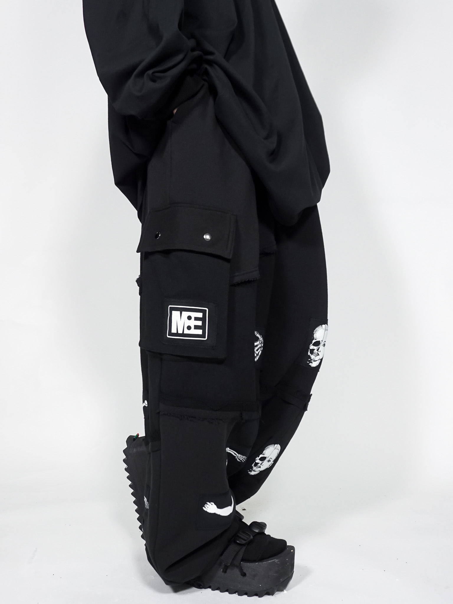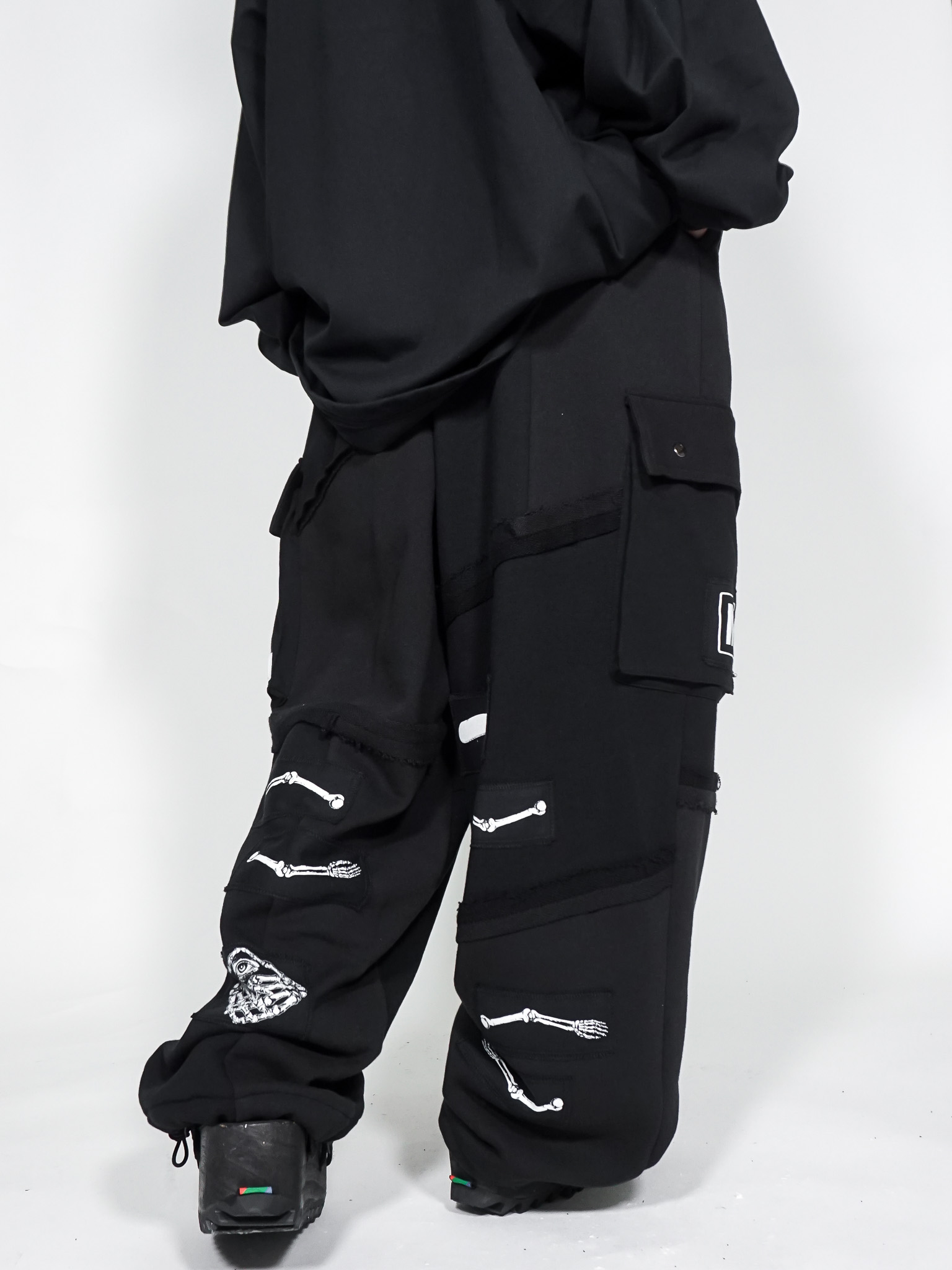 ※2種類の黒スウェット生地を使用したパッチワーク仕様のワイドカーゴパンツ、