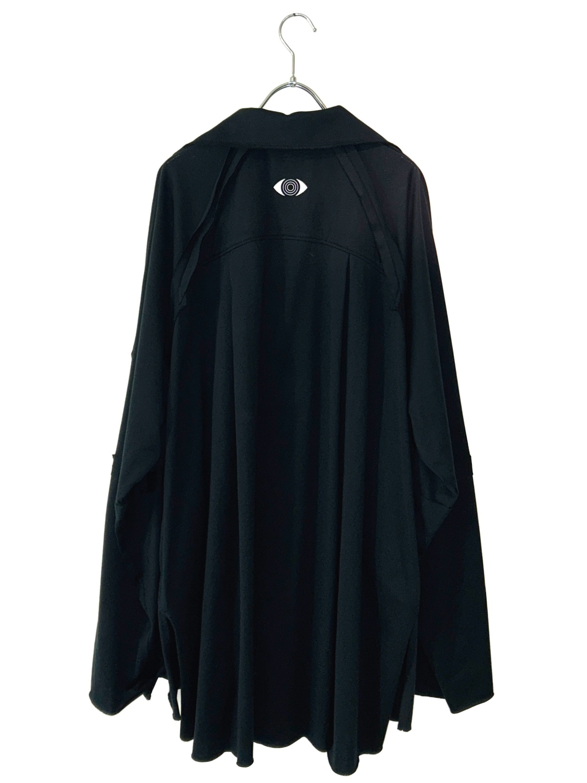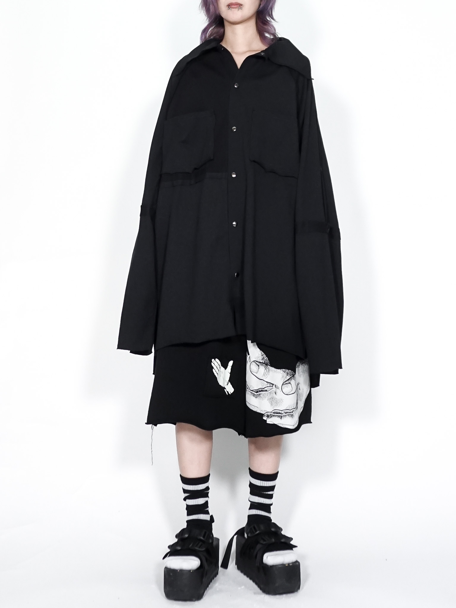 ※M:Eの黒無地6つボタンのBIGシャツ、ボタンはスナップボタンで開閉。