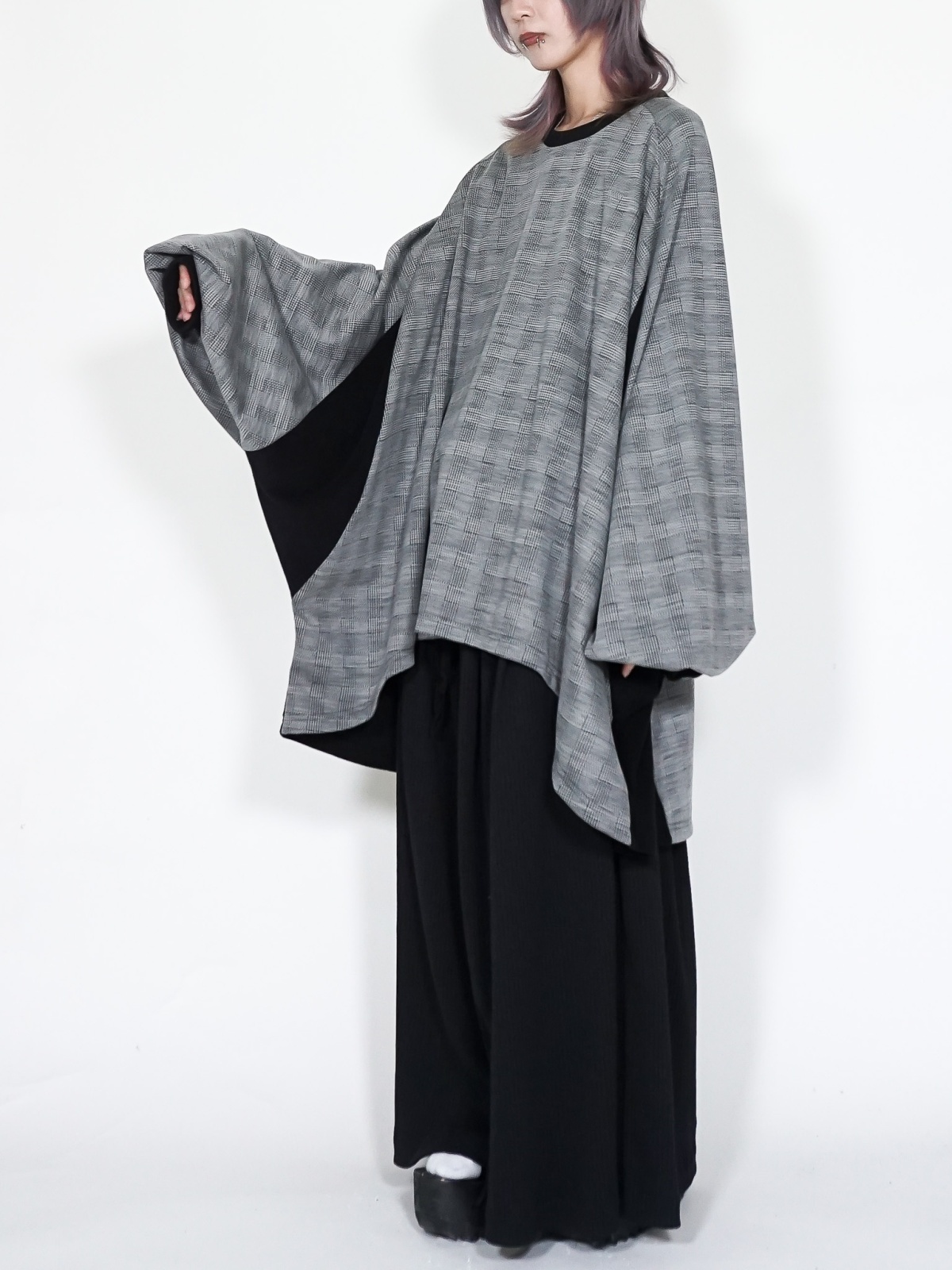 コウモリのようなシルエットが特徴的なボリューミーな1着、袖はラグラン仕様。